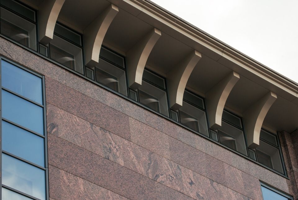 В административном здании разместился аппаратный комплекс Межрегионального центра информатизации, обеспечивающий обработку учетно-операционных документов территориальных учреждений Центрального Банка. Конструктивно здание Банковского комплекса представляет собой стальной каркас с кирпичными наружными ограждающими стенами. Оно включает в себя административные помещения, подземный паркинг, столовую, спортзал, конференц-зал. Дополнительным энергосберегающим фактором объекта стал вентилируемый фасад с наружными панелями из керамического гранита. Фасад здания, выходящего на улицу Ломоносова, представляет собой редкий для Петербурга пример планарного остекления: со второго до пятого этажа ограждающие конструкции комплекса облицованы полированным стеклом. В целом проект предусматривал значительную площадь остекления помимо фасада — это оранжерея на крыше, естественный свет в зале совещания, а также перекрытие атриума, площадь которого составляет 400 м². Всего было смонтировано около 2000 м² стеклянных поверхностей.