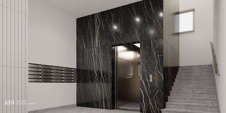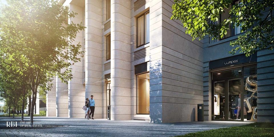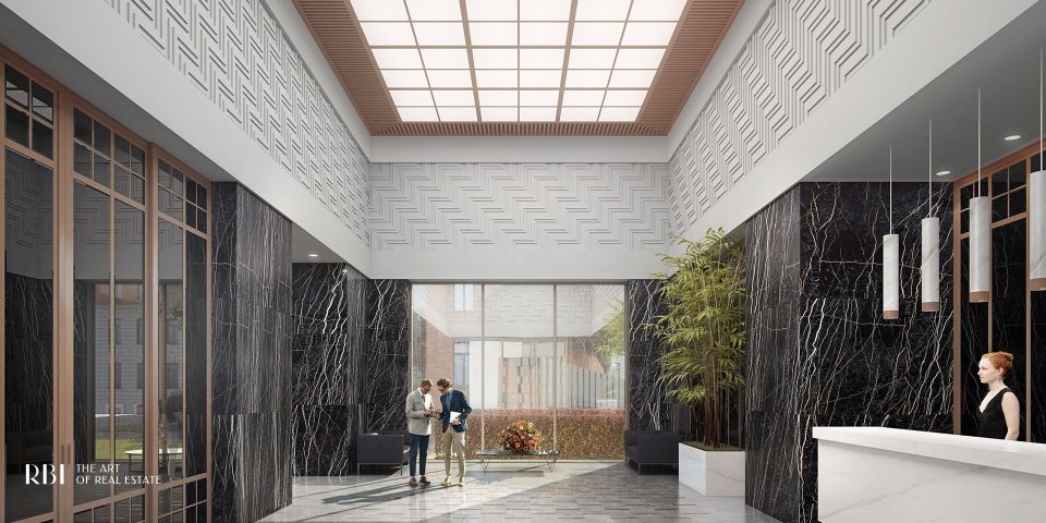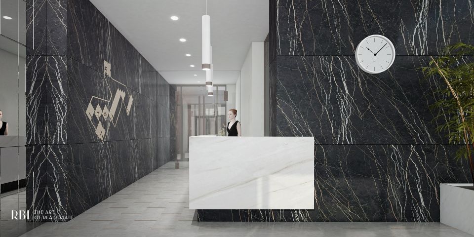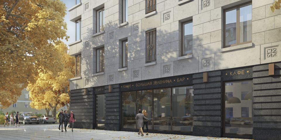 Дизайн интерьеров построен на игре контрастов: светло-серые полы и пилоны, облицованные темным керамогранитом; гладкие поверхности черного витражного стекла в деревянном обрамлении и геометричный лепной орнамент фриза